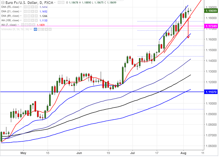 - EURUSD has recovered slightly after hitting low of 1.18305 yesterday. The pair formed a fresh 18 month high 1.19098 on Aug 2nd 2017. Any bullish continuation can be seen above 1.19098. It is currently trading around 1.18797 0.10% higher.