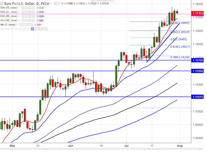 - EUR/USD has formed a minor bottom around 1.16500 on Jul 27th 2017 low and recovered from that level. The pair jumped till 1.17640 yesterday. It is currently trading around 1.17310.