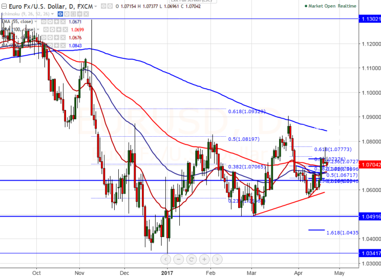 - EUR/USD dropped against dollar yesterday after news of terrorist attack in Paris, ahead of Presidential election this Sunday. Euro declined after hitting the high of 1.07720 level. It is currently trading around 1.07053.