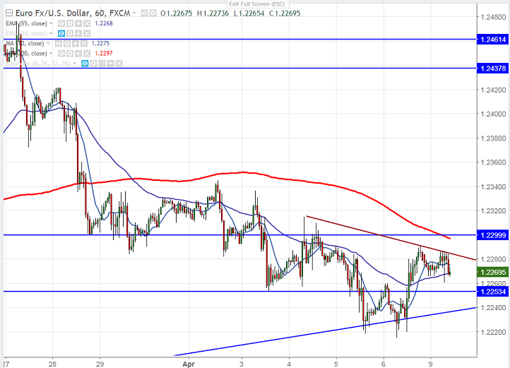 - EUR/USD has shown a good jump on Friday paring loss made in previous week. The slight weaker than expected US Nonfarm payroll data pushed the Euro prices higher. US economy has added 103k jobs in Mar compared to 193k. US wage growth shows a minor recovery from 0.1% to 0.3%. The pair jumped almost 80 pips from Friday’s low. It is currently trading around 1.22711.