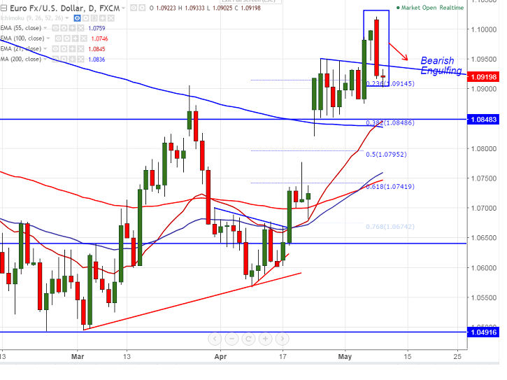 EUR/USD falls after hitting high of 1.10212 after French elections result on account of profit booking. The pair declined till 1.09025 at the time of writing. It is currently trading around 1.09124.