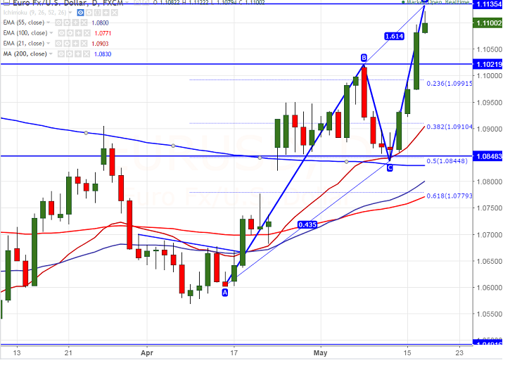 - EURUSD shown a huge jump after breaking 1.10200 high formed after French Elections. The pair jumped till 1.11222 at the time of writing. It is currently trading around 1.10908.