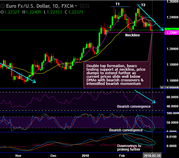 The double top formation is spotted out on EURUSD daily chart, while bears heading for a test of support at neckline.