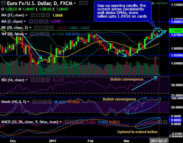 On daily charts, gap up opening is seen at 1.0833 levels to break out a stiff resistance at 1.0810 levels, the sustenance above these levels would drag the rallies upto 1.0950 levels (next immediate resistance levels).