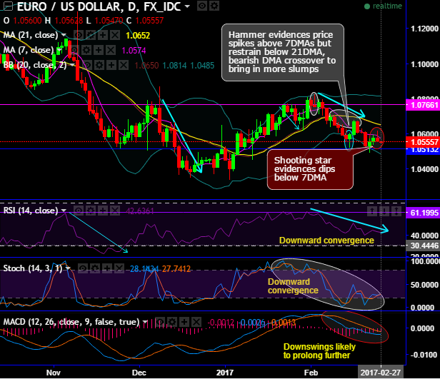 The hammer pattern occurred at 1.0599 levels and evidences price spikes above 7DMAs but restrain below 21DMA, for now again the same pattern is occurred at 1.0557 levels subsequently, we’ve seen the evidences of bull swings but restraining again at 7DMAs. Thereby, we can foresee the weakness in this pair on repetitive struggle at DMAs with bearish DMA crossover to bring in more slumps (daily charts).