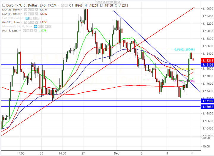 - Technically, the pair is facing strong resistance at 1.18548 (61.8% fibo) and any minor bullishness can be seen only above that level. Any break above 1.18548 will take the pair to next level till 1.1900/19612 (Nov 27th 2017 high).