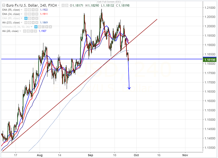 - EUR/USD has broken the Aug low of 1.1823 on German political uncertainty after elections. The pair declined till 1.18100 and is currently trading around 1.18187.