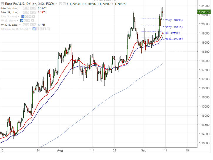 - EUR/USD has shown a huge recovery after breaking psychological resistance 1.2000 yesterday. The pair jumped till 1.20595 after ECB meeting. In the Asian session Euro continued its winning streak and jumped till 1.20922. It is currently trading around 1.20660.