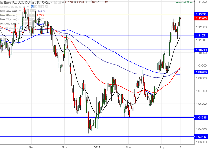 - EURUSD hits fresh six – month high of 1.1284 on Friday on account of weaker than expected U.S Nonfarm payroll. U.S economy has added 138K in May compared to forecast of 174K and unemployment rate at 16- year low at 4.3%.
