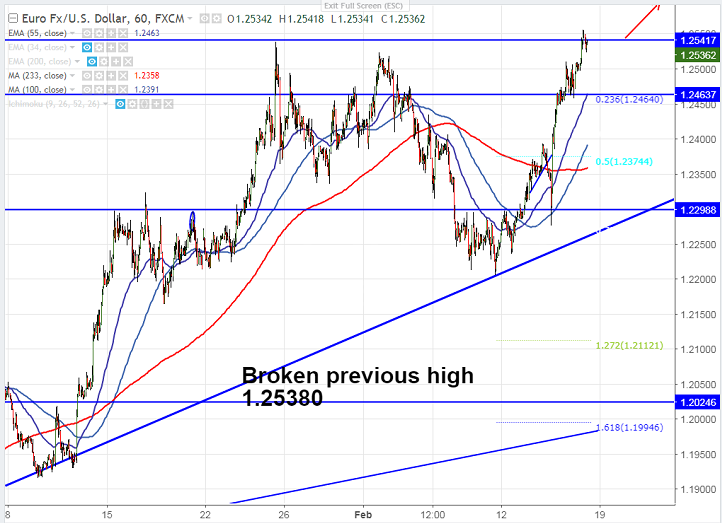 - EUR/USD hits fresh 3- year high in Asian session after breaking 1.25380 high made on Jan 25th 2018. The pair hits intraday high of 1.25542. It is currently trading around 1.25380.
