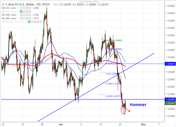 - EUR/USD pared some of its losses made in European session after slightly weaker than expected German IFO data. German IFO falls below expected level in Apr. It came at 102.1 in Apr compared to forecast of 102.80 and down from 103.3 in March. The Ifo 'current business assessment ‘also came at 105.7 slightly weaker than expected level of 106. The pair jumped till 1.2223 and is currently trading around 1.22131