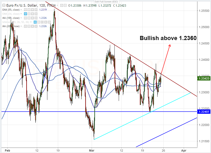 - The pair is facing near term resistance of 1.2360 and break above will take the pair till 1.24000/1.24450. Bullish continuation can be seen above 1.2550.
