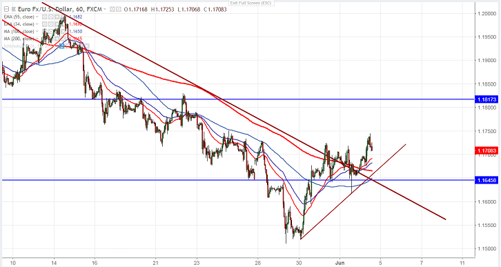 - EUR/USD regains above 1.1700 level and hits high of 1.17444 on US trade war worries. US economy has added 223k jobs in the month of May and unemployment data at 18- year low at 3.8%. US average hourly earnings rose by 0.3% last month compared to forecast of 0.2%. The data was positive for USD but US trade war with other countries has dragged the USD down. The pair hits low of 1.16169 on Friday and jumped more than 140 pips.US factory orders data came at -0.8% compared to forecast of -0.4%. It is currently trading around 1.17116.