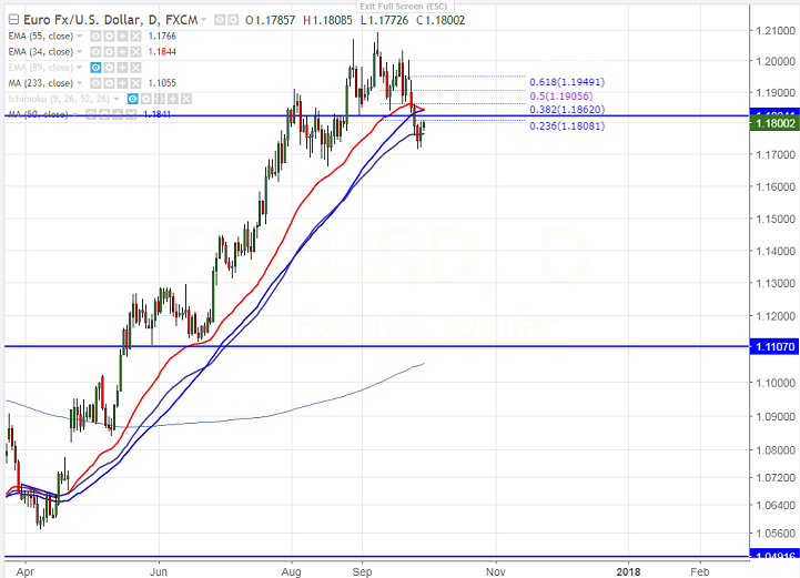 - EUR/USD has recovered after hitting low of 1.17170 on Sep 27th 2017. The pair shown a minor jump above 1.18000 and declined slightly after weaker than expected EU inflation. It hits intraday high of 1.18085 and is currently trading around 1.18007.