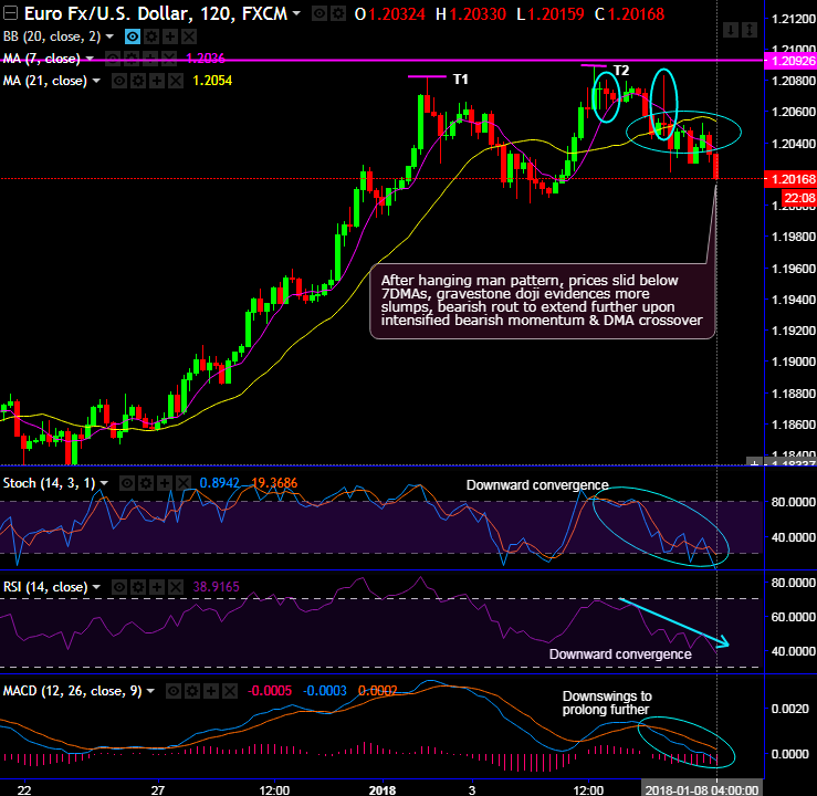 After bearish pattern, prices slid below 7SMAs, gravestone doji occurs at 1.2051 level that evidences more slumps. Consequently, steep slumps below SMAs with bearish SMA crossover, for now, bearish rout to extend further upon intensified bearish momentum.