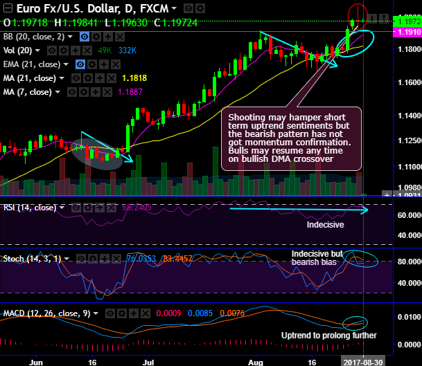 In yesterday’s rallies, shooting star candlestick pattern has occurred at the peaks of 1.1971 levels. Consequently, today’s trade sentiment has been little edgy during Asian trading sessions.