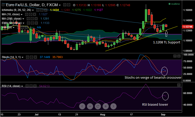 - Support on the downside is seen at 1.1259 (4h Tenkan-Sen), breach below which could see the pair testing Trendline support at 1.1208