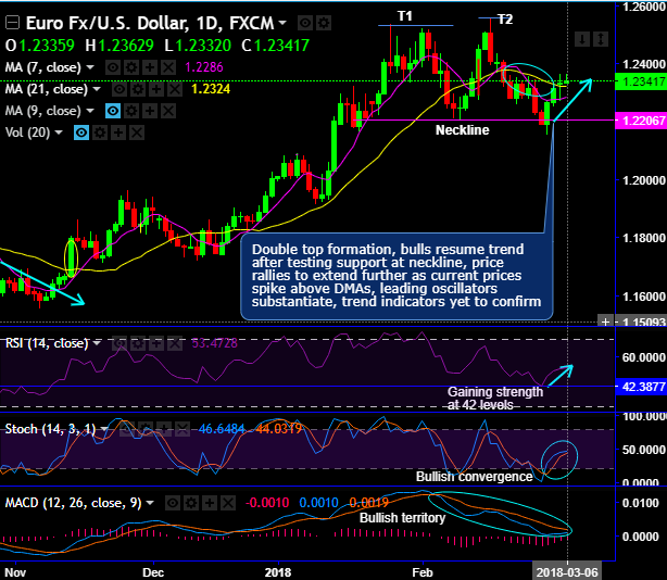 The double top formation is spotted out on EURUSD daily chart, while bulls resume uptrend after testing support at neckline.