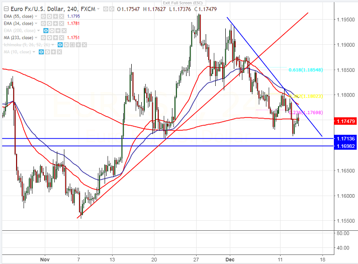 - The US fed is expected to hike interest rate by 25bpbs and market have already factored the rate increase. Any hawkish comment by fed on rate hike will drag the euro further down. The reason for minor recovery in Euro yesterday after Democratic candidate Doug Jones defeated Trump backed Roy Moore which will make tough to pass tax bill.