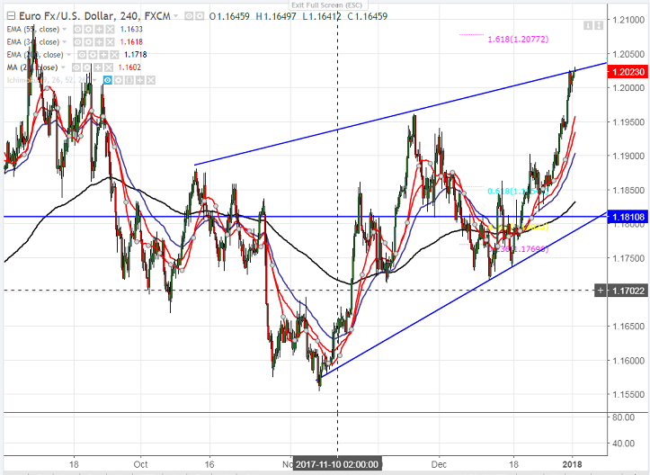 - EUR/USD is trading high and closed above 1.2000 level on Friday. The pair jumped till 1.20270 at the time of writing after forming a minor bottom at 1.17176 on Dec 12th 2017. The main reason for decline in US dollar is sharp selloff in US 10 year bond yields from high of 2.499% till 2.40%. It is currently trading around 1.20253.