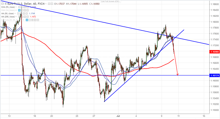 - EUR/USD’s near term support is around 1.16500 (20- day MA) and any break below will drag the pair to next level till 1.1600/1.1500.Any break below 1.1500 confirms minor weakness and decline till 1.1400/1.13600 is likely.