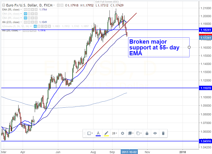 - EURUSD has broken major support of 1.1760 (55- day EMA) and declined till 1.17312 at the time of writing. The pair has closed slightly below 1.1800 yesterday and is currently trading around 1.17414.