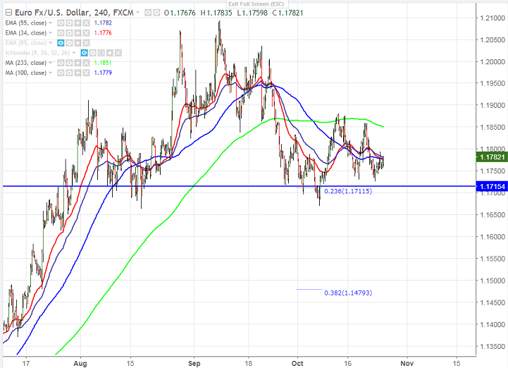 - EUR/USD is trading in narrow range between 1.18803 and 1.17250 for the past 9 trading days. Major event for EUR and ECB meeting which will be held on Thursday for further direction. The pair declined till 1.17250 on 23rd Oct 2017 and is trading around 1.17820.