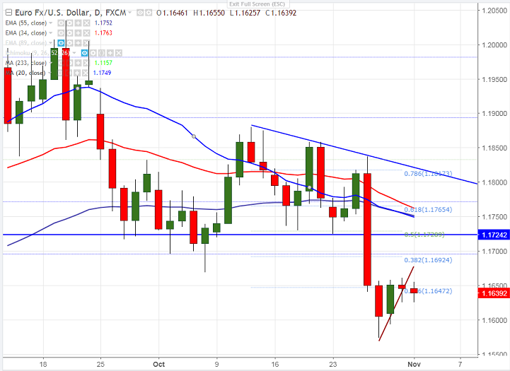 - EUR/USD has shown minor recovery after forming a bottom at 1.15716. The pair upside is capped due to weaker than expected preliminary inflation number. The Eurozone GDP rose 0.6% in the third quarter from previous one and unemployment rate falls below 9% for the first time since 2009. The pair jumped till 1.16612 and currently trading around 1.16390.