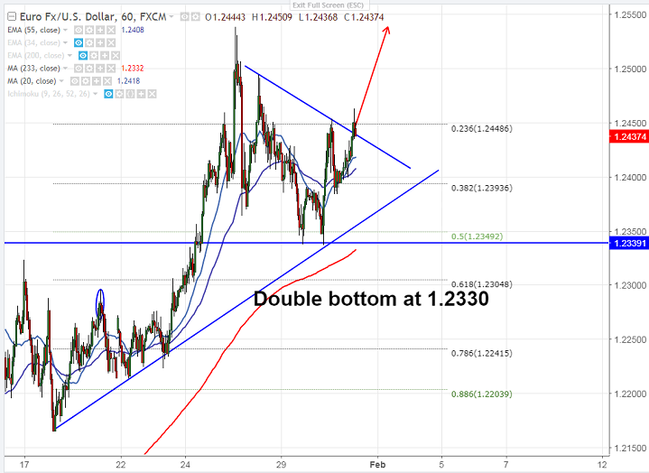 - EUR/USD formed a minor bottom at 1.23365 and shown a minor recovery above 1.2400. The pair is holding well above 1.2400. The pair jumped till 1.24625 and is currently trading around 1.24384.