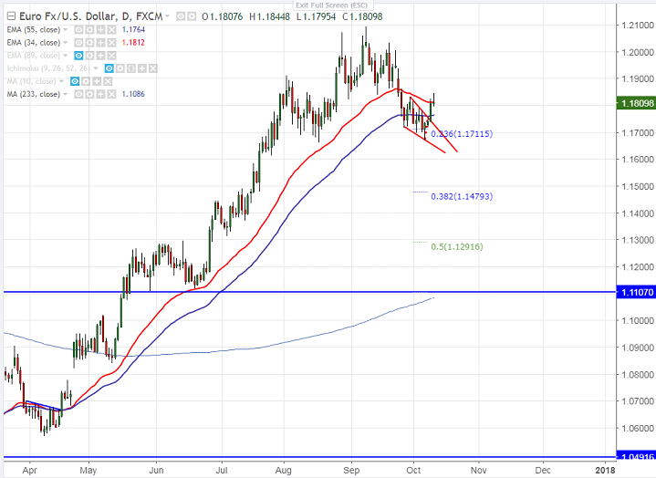 - EUR/USD recovered sharply from the low of 1.16621 on easing geopolitical tensions in Spain and ECB QE tapering program. The pair jumped above 1.18325 high made on Sep 29th 2017 till 1.18448. It is currently trading around 1.18100.