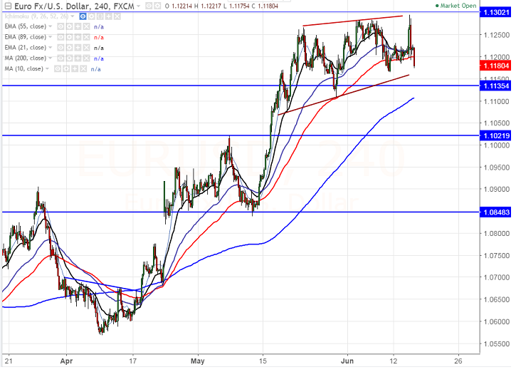 - EUR/USD declined form the high of 1.12957 yesterday after slightly hawkish tone of Fed. The pair hits the low of 1.11930 yesterday and closed at 1.11828.