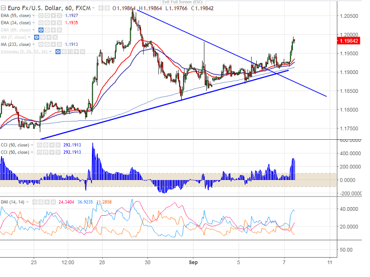 - EUR/USD has shown a huge recovery after hitting trend line support at 1.18683 yesterday. The pair is waiting for ECB meeting which is to be held on Sep 7th for further direction. It has broken resistance 1.19796 high made after U.S Nonfarm payroll. It is currently trading around 1.19842.