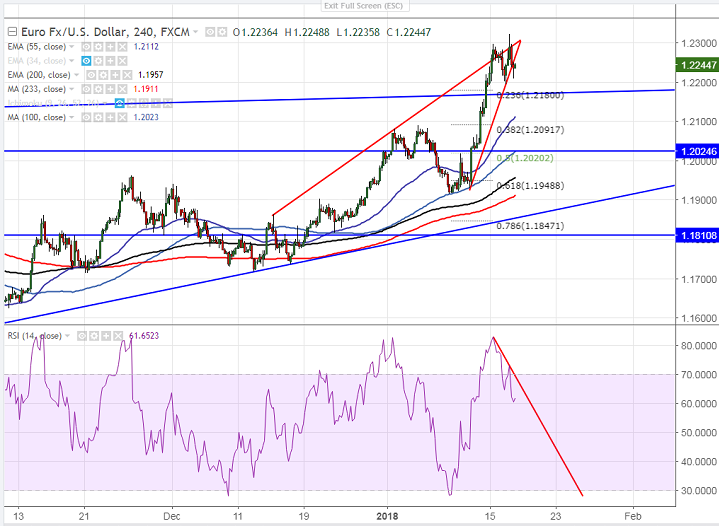 - EUR/USD has shown a minor correction after a good upside move in previous week. The pair was trading strong in previous week on account of political stability in Germany and hawkish comment from ECB members. The pair jumped till 1.2296 yesterday and is currently trading around 1.22318.