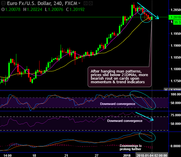 Hanging man pattern candles have occurred at 1.2044, 1.2058, 1.2032, and 1.2027 levels on EURUSD intraday plotting. After these bearish patterns, consequently, the prices slid below 21DMAs, more bearish rout on cards upon momentum & trend indicators.