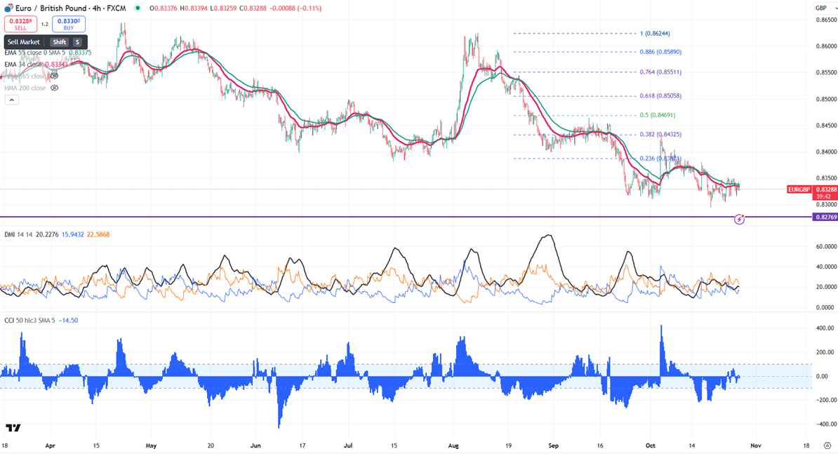 EURGBP trades weak due to policy divergence between the ECB and BOE. Intraday bias remains bearish as long as resistance 0.8380 holds. It hit a high of 0.83427 at the time of writing and is currently trading around 0.83298.