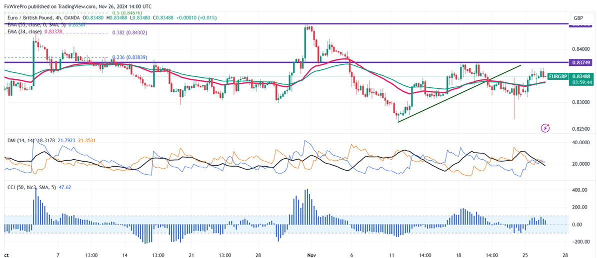 EURGBP showed a minor pullback on board-based Pound sterling weakness. Intraday bias remains bullish as long as support 0.8300 holds. It hit a high of 0.83614 at the time of writing and is currently trading around 0.83582.