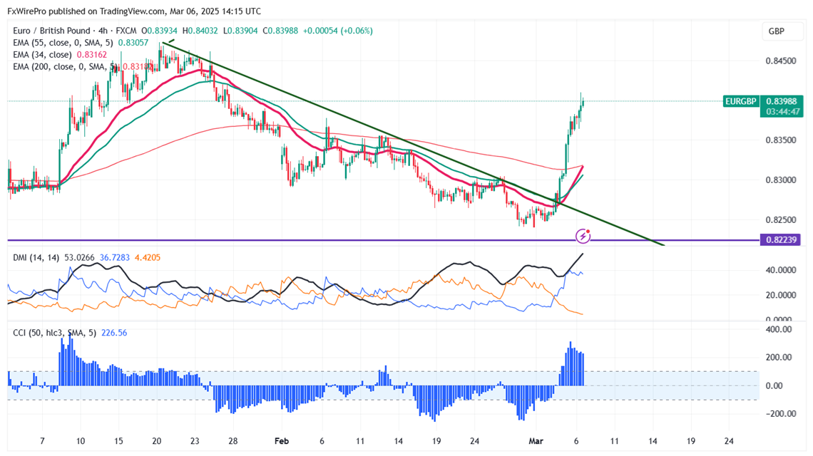 The pair is trading higher due to policy divergence between the ECB and BOE. Intraday bias remains bullish as long as resistance 0.8320 holds. It hit an intraday high of 0.84101 and is currently trading around 0.83977.
