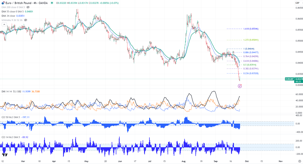 EURGBP showed a minor pullback after a massive sell-off. Intraday bias remains bearish as long as 0.8400 holds. It hits a low of 0.83174 at the time of writing and is currently trading around 0.83300.