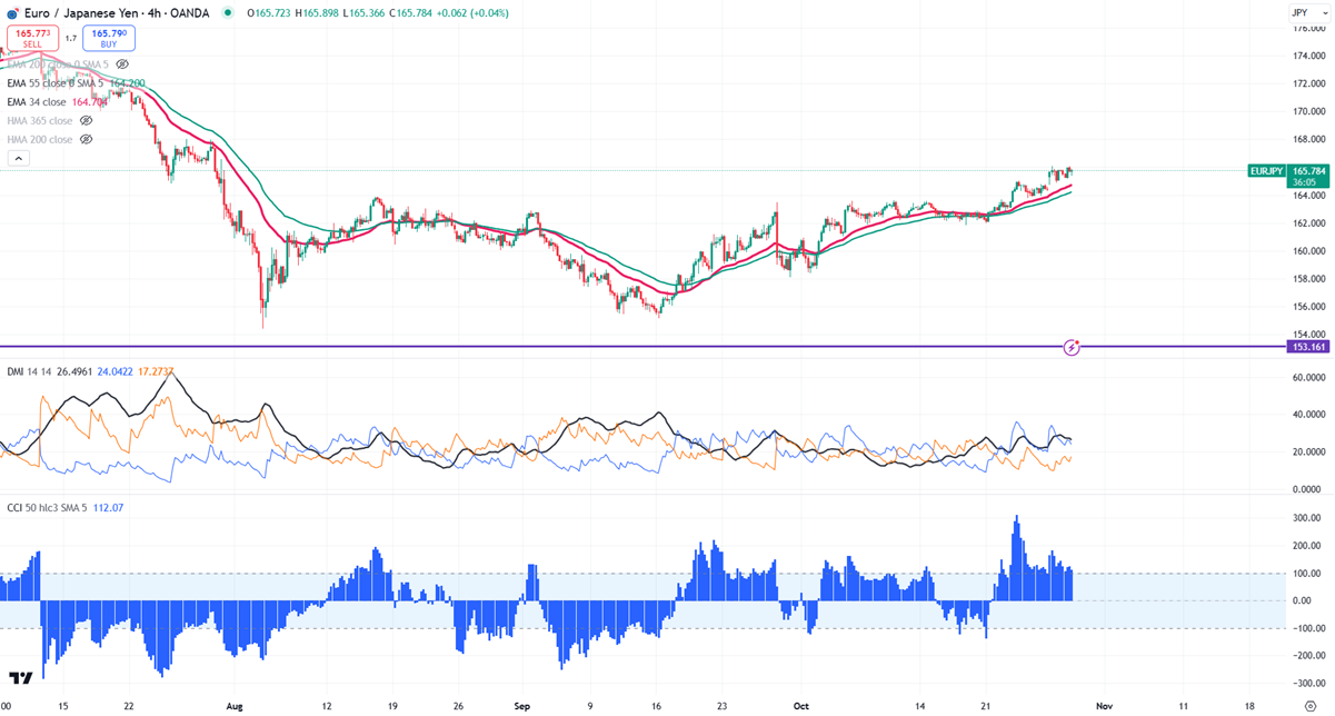 The pair is currently above the 34- and 55 EMA, as well as the 365 Hull moving average on the 4-hour chart.