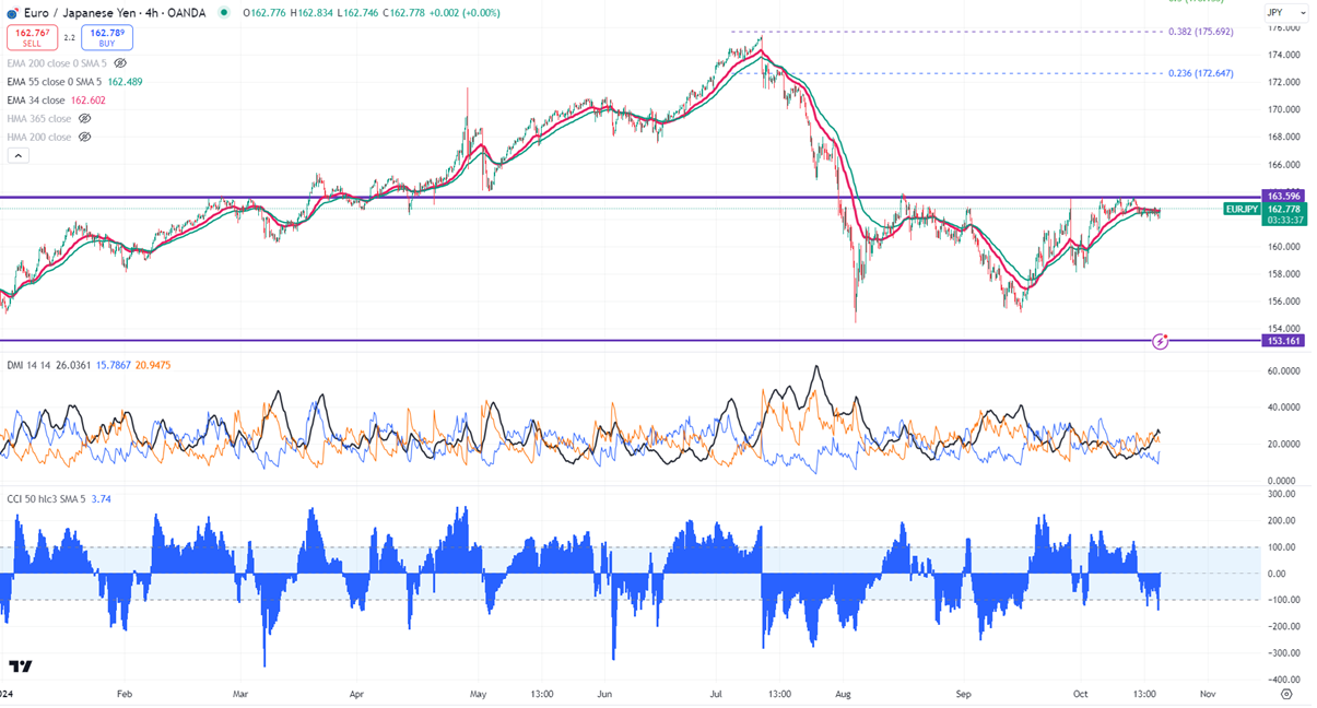 The EUR/JPY trades weak on the strong yen. It hit a low of 161.98 at the time of writing and is currently trading around 162.08.
