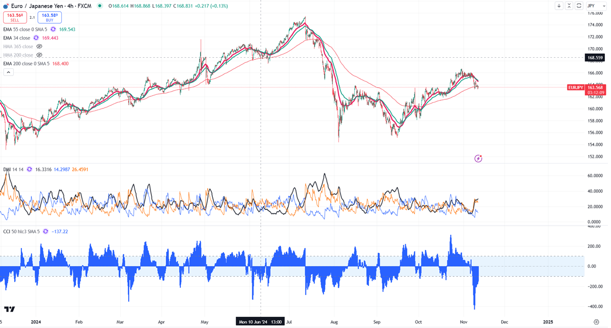 The pair is currently below the 34- and 55 EMA, as well as the 365 Hull moving average on the 4-hour chart.