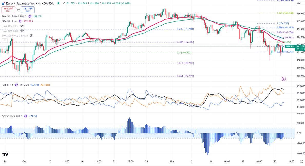 EUR/JPY showed a minor pullback as the Euro recovers. It hit a low of 160.57 yesterday and is now trading around 161.45. The intraday outlook is bearish as long as the resistance 163 holds.