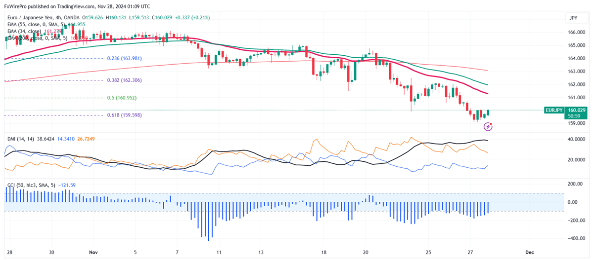 The EUR/JPY pair is trading below the 34 and 55 EMA, as well as the 365 Hull moving average on the 4-hour chart.