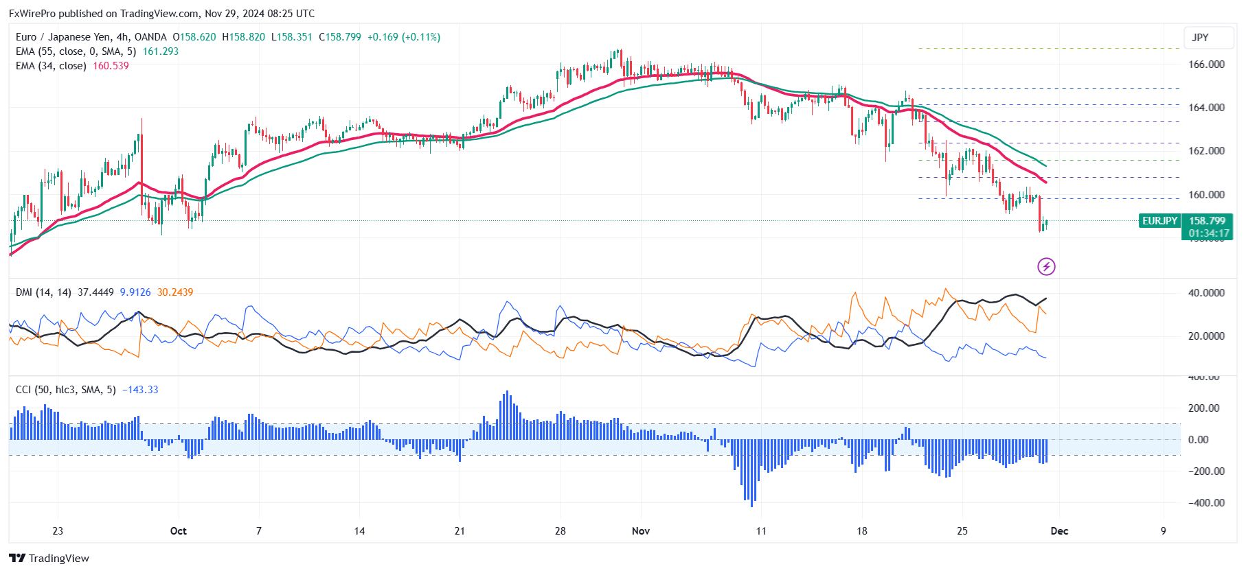 The EUR/JPY pair is trading below the 34 and 55 EMA, as well as the 365 Hull moving average on the 4-hour chart.