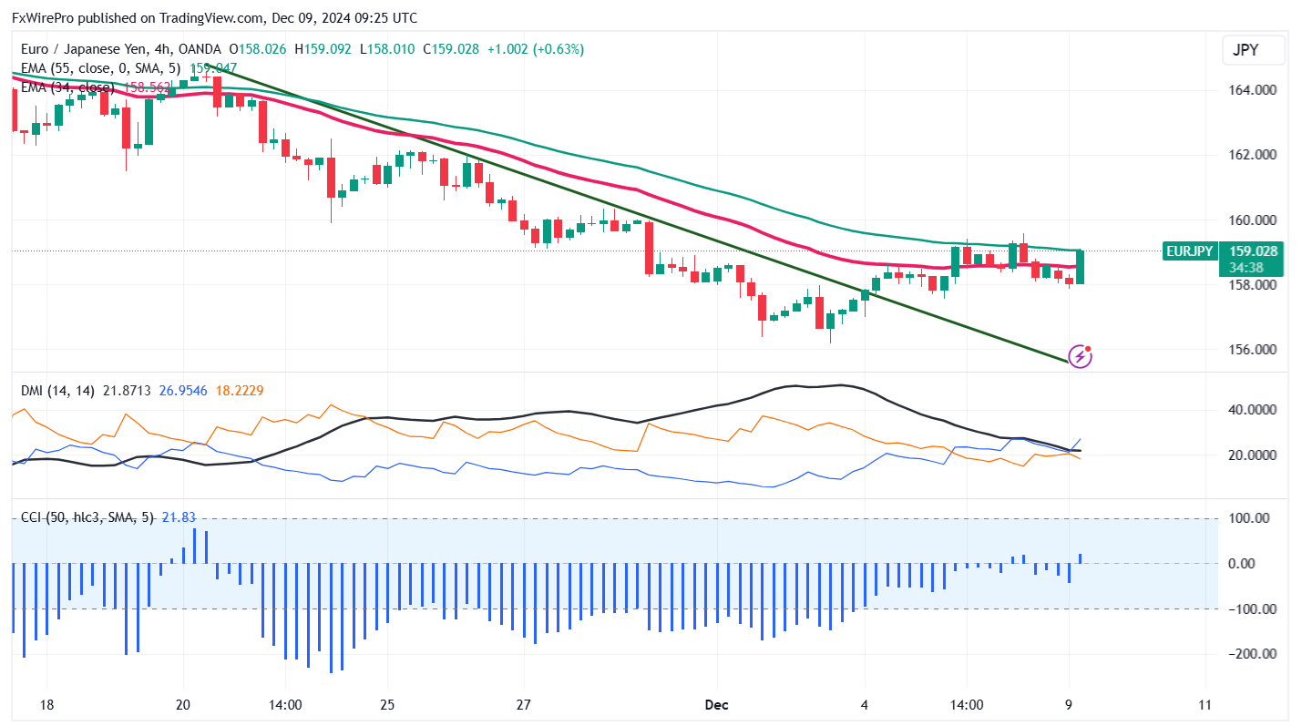 The EUR/JPY pair is trading above the 55 EMA and below the 34 EMA as well as the 365 Hull moving average on the 4-hour chart.