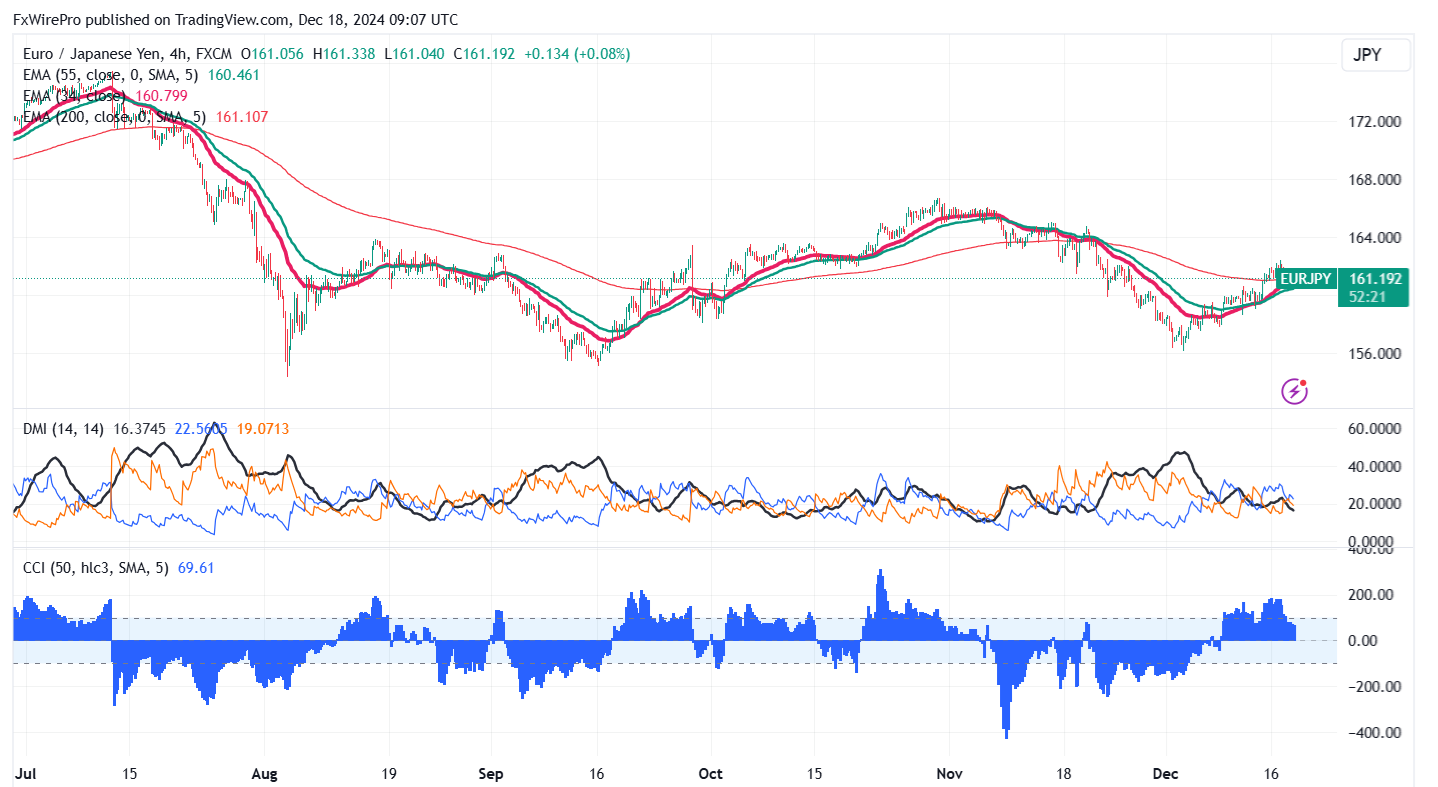 The EUR/JPY pair is trading above the 55 EMA and below the 34 EMA as well as the 365 Hull moving average on the 4-hour chart.