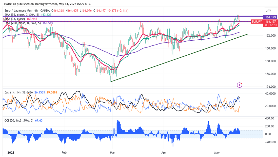 The EUR/JPY pair is trading above 34, 55 EMA and above 200-4H EMA on the 4-hour chart.