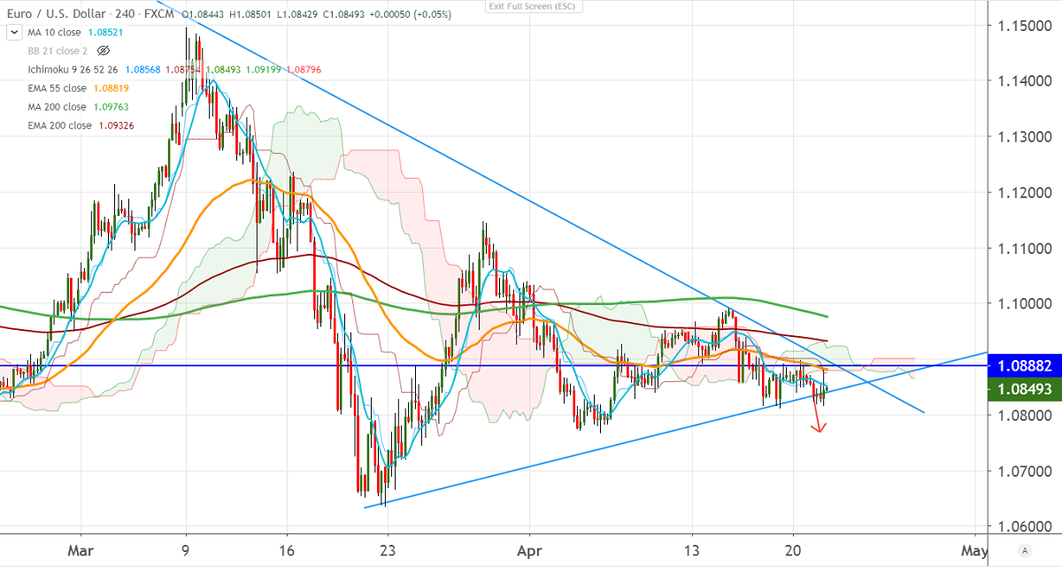 EURUSD is trading in a narrow range between 1.07680 and 1.09909 for the past 2-weeks. The reports show that North Korea's leader Kim Jon nhealth is in grave danger after surgery and the oil crash is supporting the US dollar as Safe-haven demand increases. It hits an intraday low of 1.08166 and is currently trading around 1.08480.