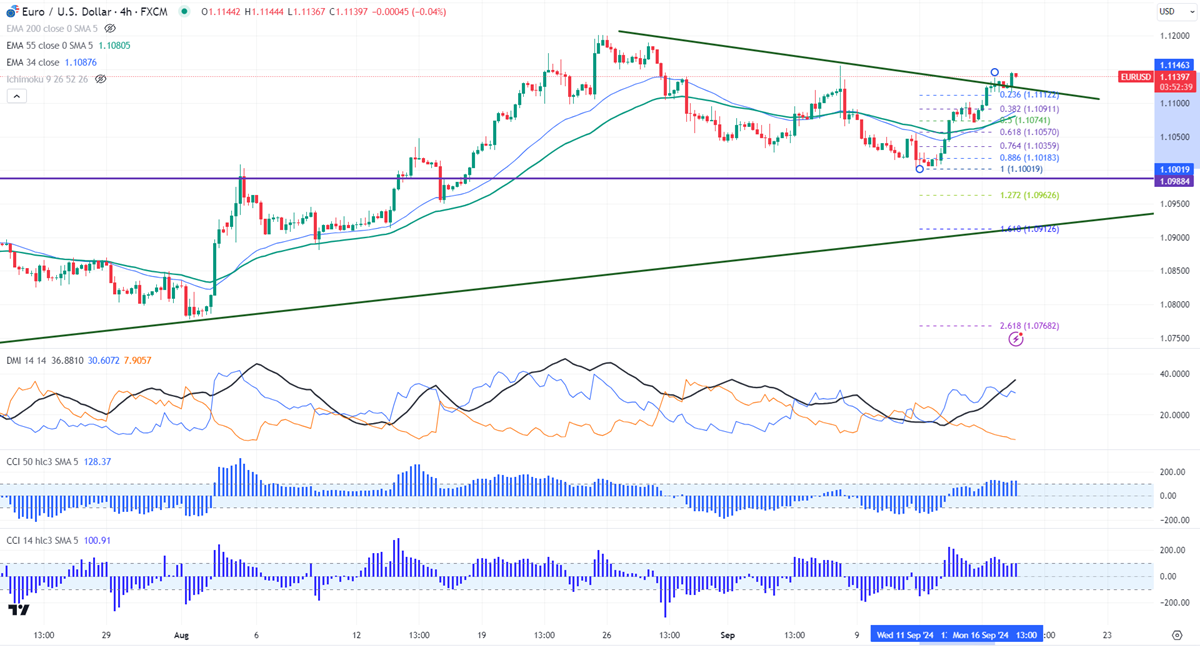 EURUSD trades above trend line resistance on 50 bpbs rate cut hopes. It hits a high of 1.11463 at the time of writing and is currently trading around 1.11447.