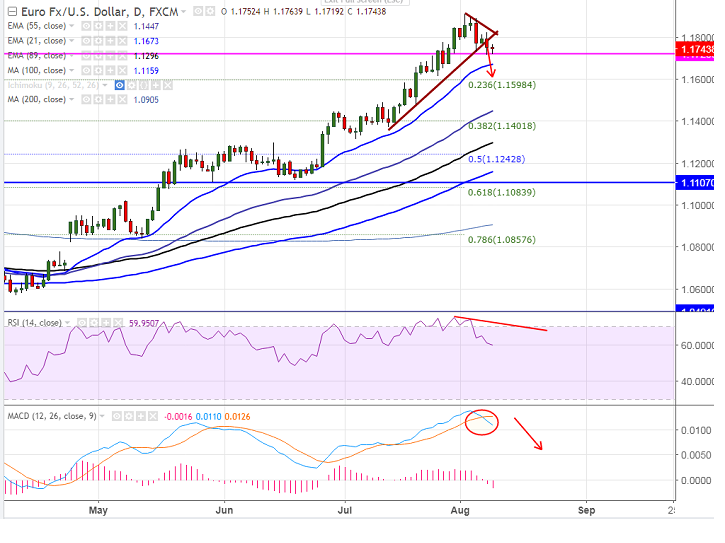 - On the lower side, any convincing break below 1.17200 will drag the pair down till 1.1660 (21- day EMA)/1.15980 (23.6% retracement of 1.05694 and 1.19098).